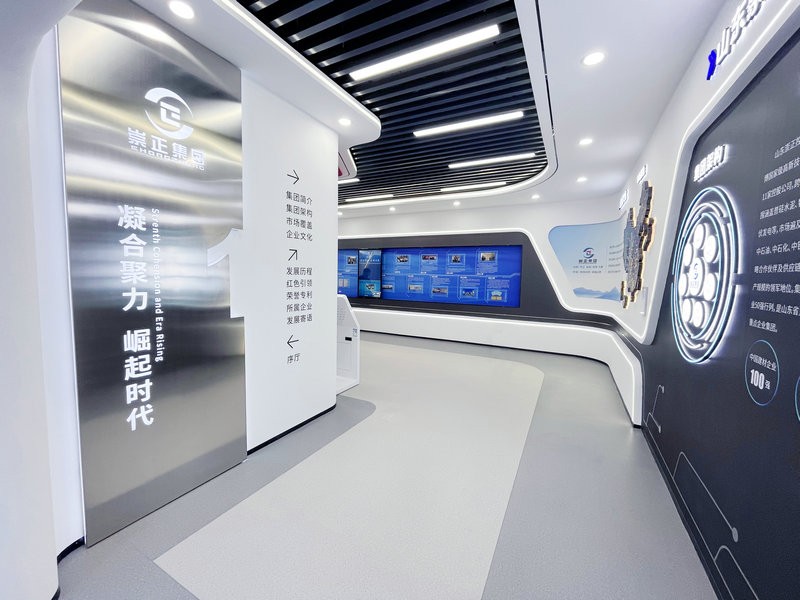 展廳中多處運用電子互動大屏放映企業專題片,并且將展廳墻體直角部分改為弧形,與曲面屏呼應的同時增強了空間的整體流動性。展廳運用統一基礎標準色調,使得整個展廳風格更加統一。在頂部運用線性燈與筒燈進行融合照明,提升視覺美感。